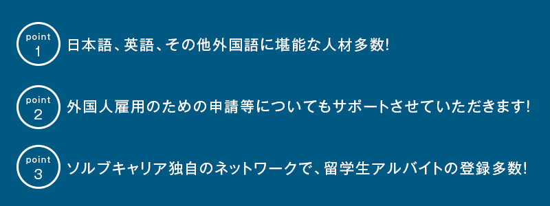ソルブキャリアは、そんな日本で働く意欲溢れた外国人スタッフの育成に努め、様々な企業様のニーズに合わせた最適なスタッフの派遣・紹介をお手伝いいたします。