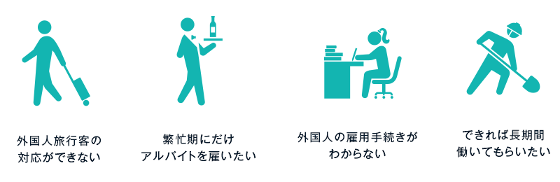 一方、人材不足で悩む日本の企業にとって、外国人労働力の活用は必要不可欠ともいえますが、そこには外国人特有の複雑な就労条件(就労ビザは特定の仕事のみ、留学生は1週間28時間以内など)や制約があります。